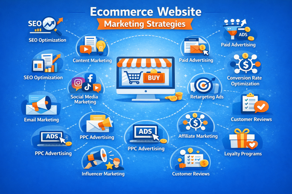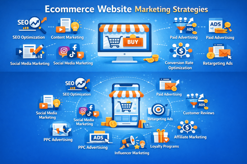 In todayโs competitive digital environment, businesses must implement multiple marketing strategies to stand out in the market. This article explains the major ecommerce website marketing strategies, their importance, and how businesses can use them to grow their online stores.